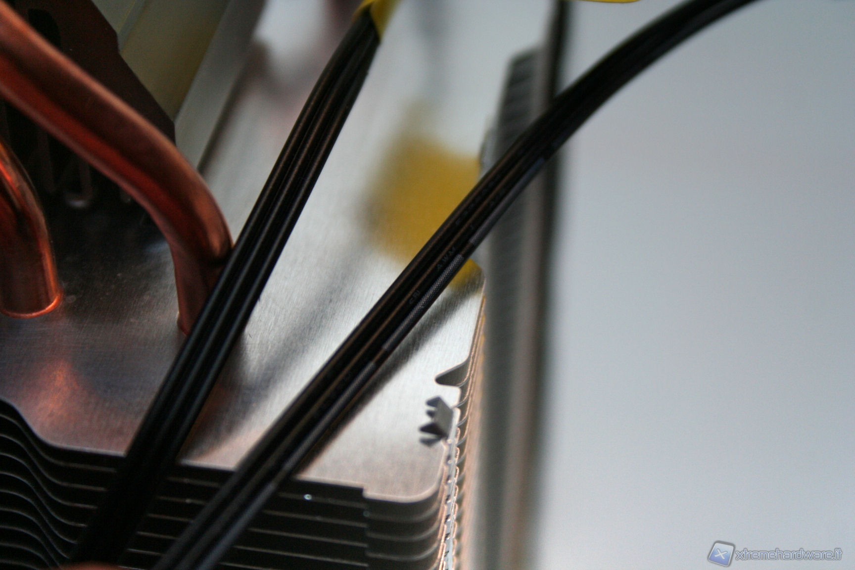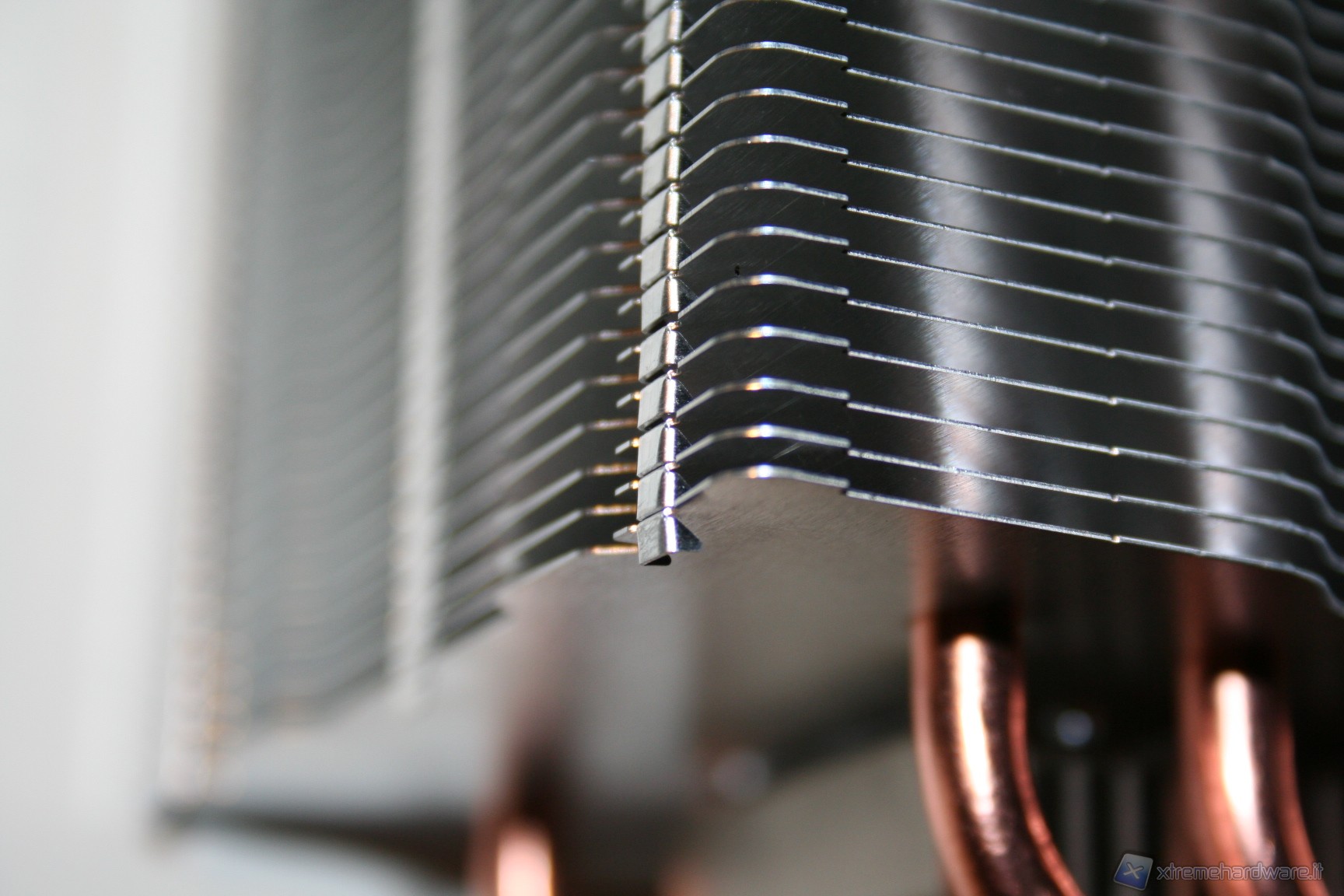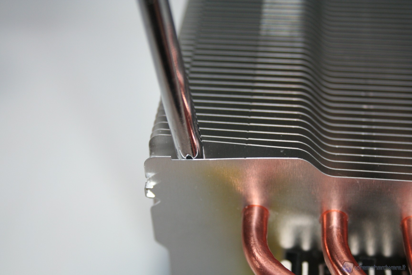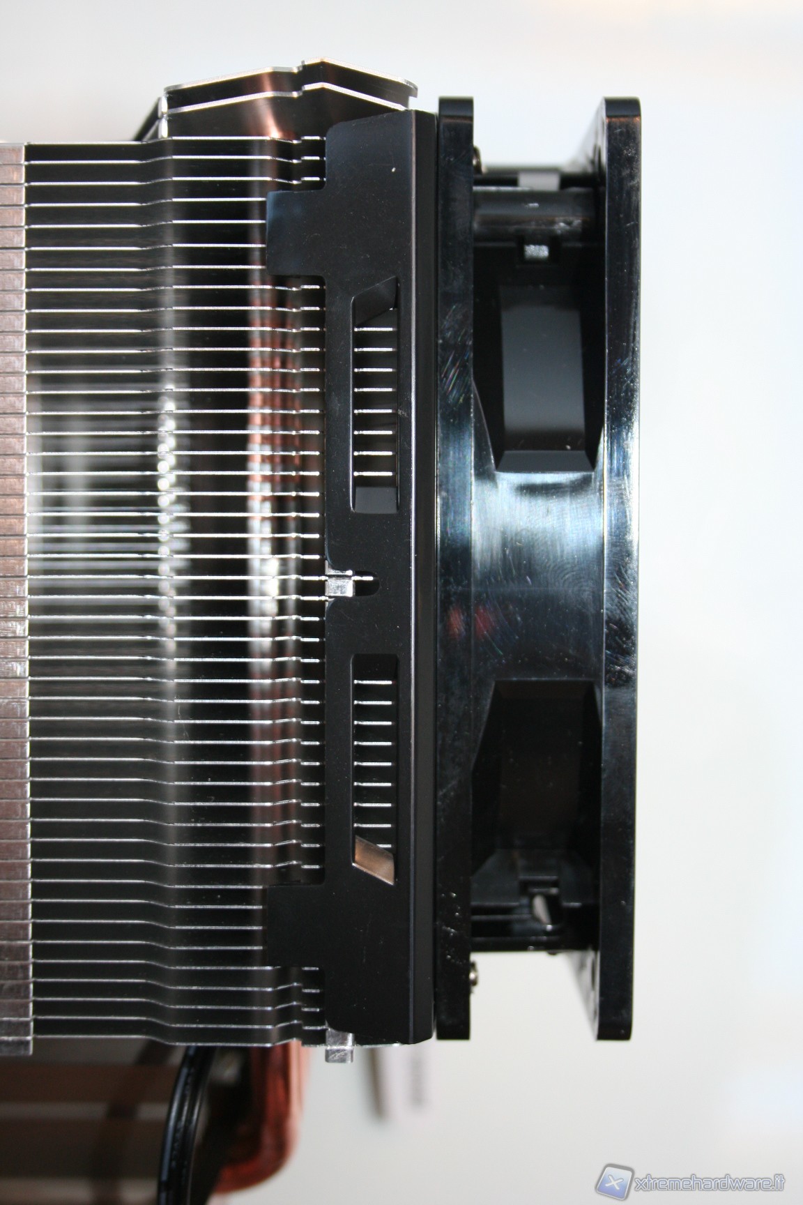 Le heat-pipe sono incastonate tra la base, a contatto con l’IHS della CPU, ed un piccolo dissipatore passivo, realizzato per migliorare l’efficienza a basse temperature. Il design presenta una disposizione delle lamelle finalizzata alla riduzione della resistenza del flusso d’aria, il che significa che quest’ultimo procederà con più regolarità tramite il corpo radiante, il quale presenta anche delle fessure interne che aumentano anche la superficie dissipante; ciò permetterà quindi di ottenere migliori risultati, in teoria, anche con ventole aventi sia un basso regime di rotazione sia una esigua pressione statica.