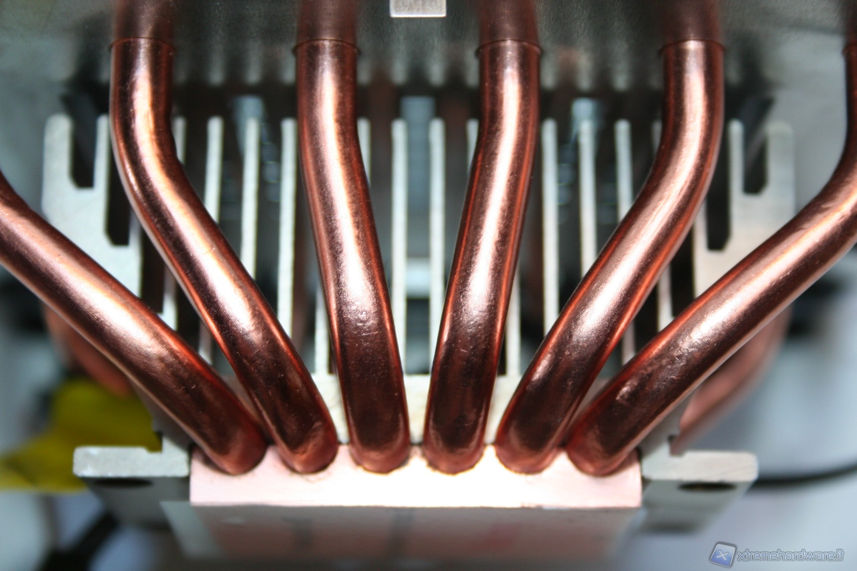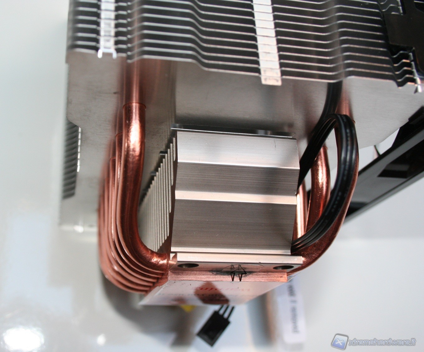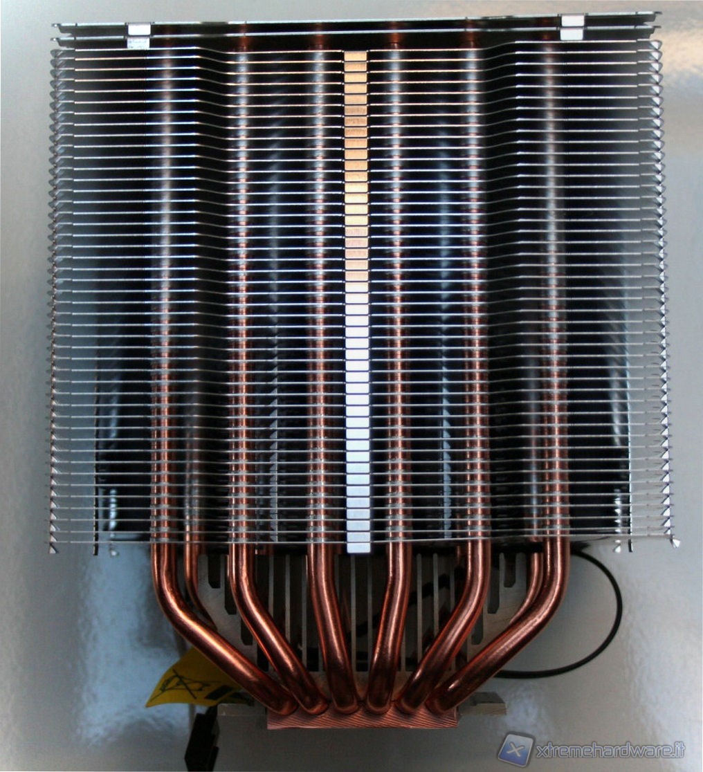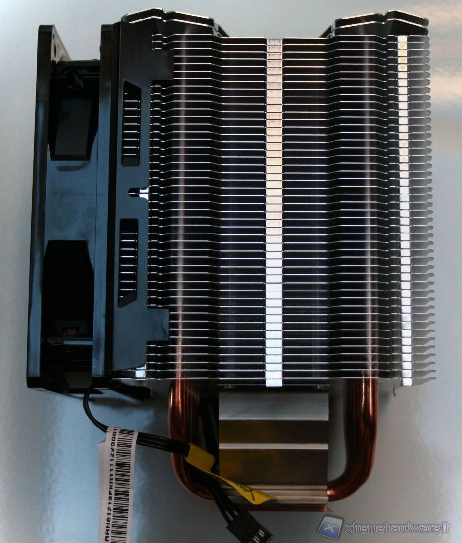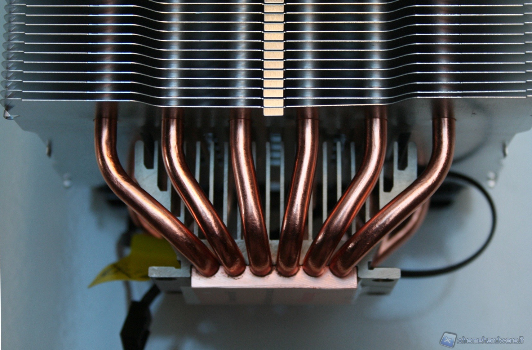 Le heat-pipe sono incastonate tra la base, a contatto con l’IHS della CPU, ed un piccolo dissipatore passivo, realizzato per migliorare l’efficienza a basse temperature. Il design presenta una disposizione delle lamelle finalizzata alla riduzione della resistenza del flusso d’aria, il che significa che quest’ultimo procederà con più regolarità tramite il corpo radiante, il quale presenta anche delle fessure interne che aumentano anche la superficie dissipante; ciò permetterà quindi di ottenere migliori risultati, in teoria, anche con ventole aventi sia un basso regime di rotazione sia una esigua pressione statica.